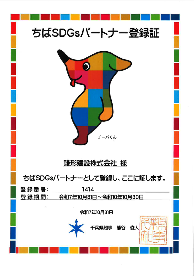 鎌形建設はSDGsの達成に向けた積極的な取り組みを認めていただき 千葉県が推進する「ちばSDGsパートナー」として登録していただいています。サスティナブルな社会を実現するため、地域や社会に貢献する企業活動を続けてまいります。