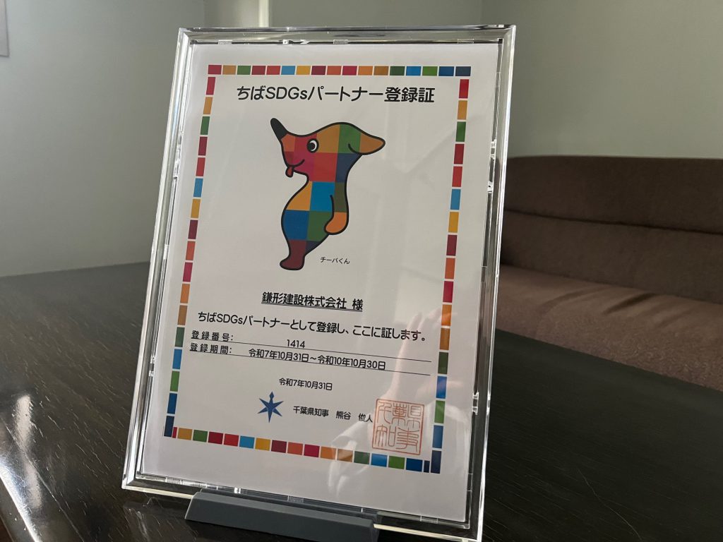 鎌形建設はSDGsの達成に向けた積極的な取り組みを認めていただき 千葉県が推進する「ちばSDGsパートナー」として登録していただいています。サスティナブルな社会を実現するため、地域や社会に貢献する企業活動を続けてまいります。