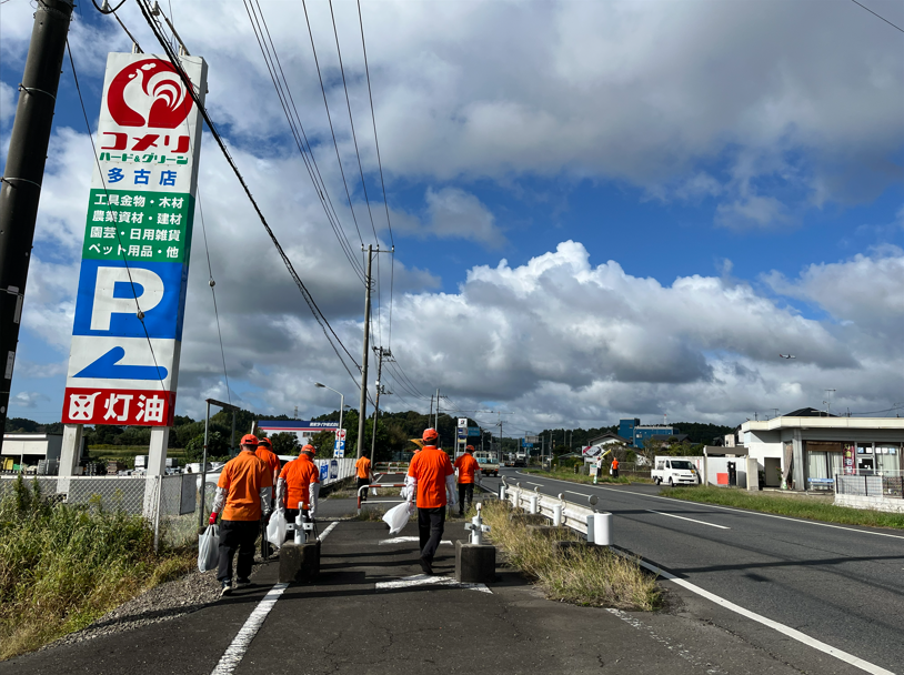 10月17日㈮ 地域貢献活動の一環として清掃活動を行いました。巡回時には安全運転ののぼりを掲げドライバーの方に交通安全を呼びかけています。引き続き地域貢献に努めていきます。