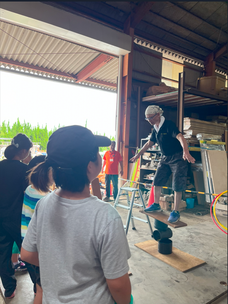 13日は突然の激しい雨が降ったりやんだりの天気でしたが、おとなも子どもも社員も笑い声のたえない時間が過ごすことが出来ました。ジャグリング体験では社員が夢中になって楽しんでいました。
