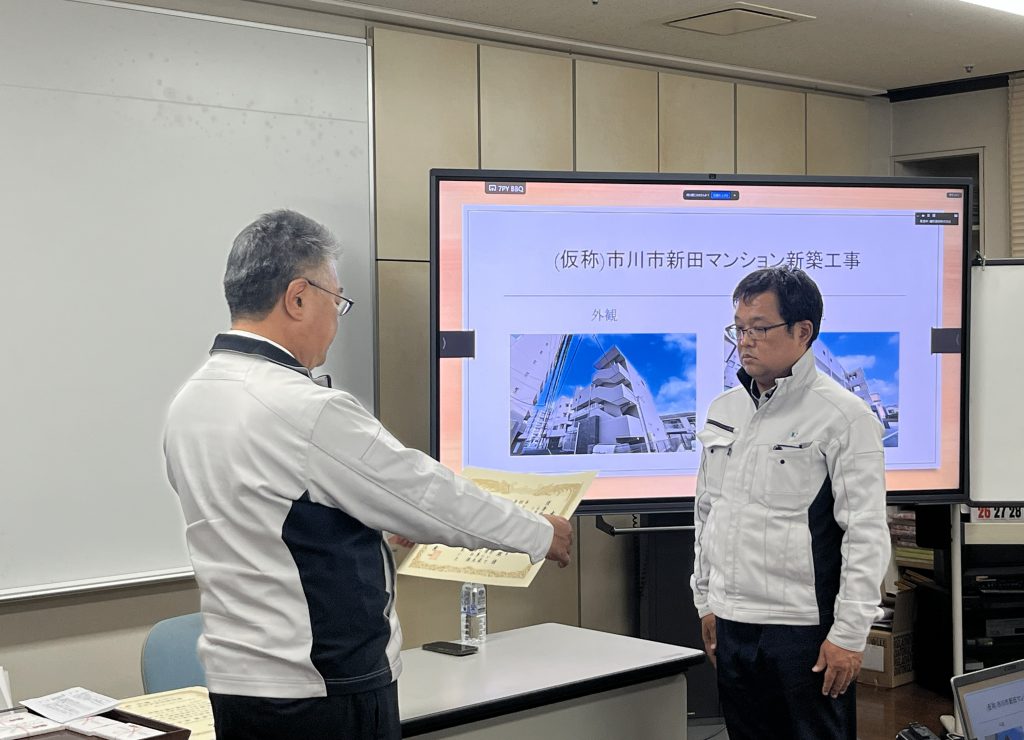 昨年末、本社二階大会議室にて仕事納めにあわせて社員が一堂に会し、社内表彰を実施しました。各部署から、この一年間、品質の高い工事に真摯に取り組んだ社員が選出され、日頃の努力と成果を称えました。受賞者の姿は、社員一人ひとりの励みとなる有意義な時間となりました。